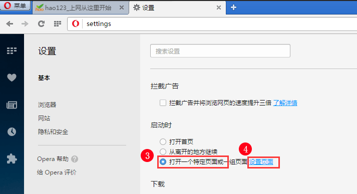 2、选择 打开一个特定页面或一组页面,点击设置页面。