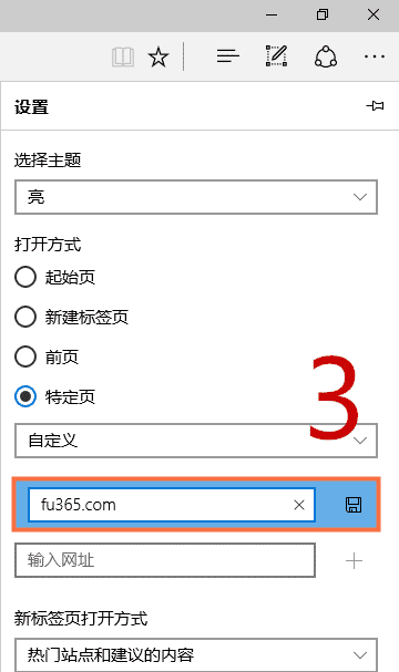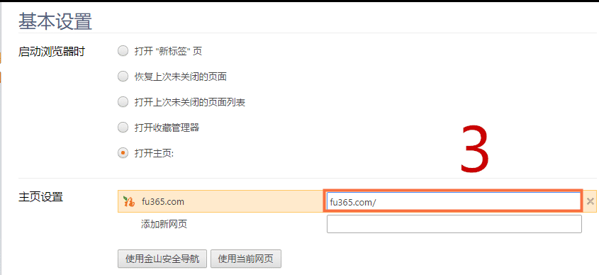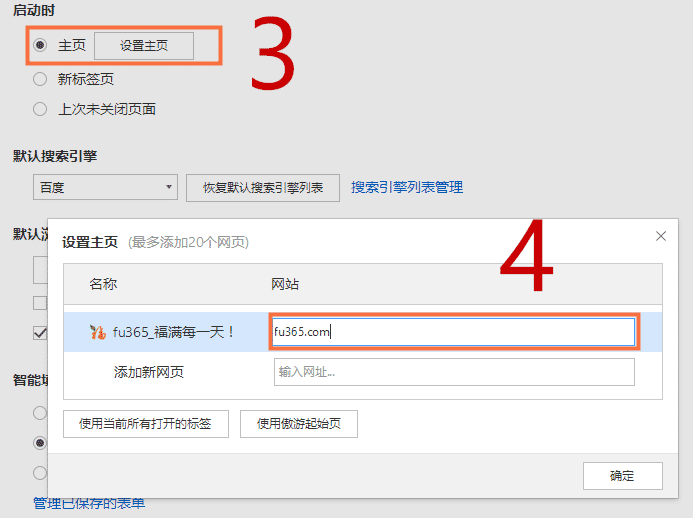 2、 选择打开主页标签,在主页设置里输入(www.fu365.com)或复制,设置自动保存,重启浏览器即可。
