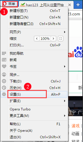 1、打开Opera浏览器,点击菜单按钮—设置,如图所示:
