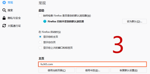 2、选择显示我的主页,在 主页 里输入(www.fu365.com)或复制,设置自动保存,重启浏览器即可。