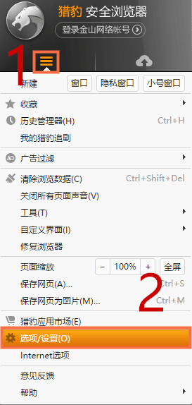 1、打开猎豹浏览器,点击浏览器图标-选项/设置,如图所示: