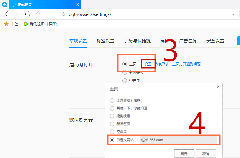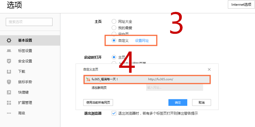 2、 选择主页,在自定义网站里输入(www.fu365.com)或复制,确定即可。